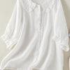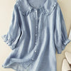 This cotton and linen shirt offers a mix of comfort and timeless charm, making it a versatile piece to add to your wardrobe. The Peter Pan collar with ruffles adds a touch of femininity, while the loose fit ensures all-day comfort.