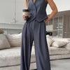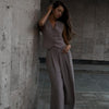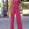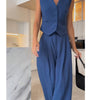 Se trata de un conjunto de dos piezas elegante y versátil, caracterizado por un blazer sin mangas con escote en V y pantalones slim-fit. Este conjunto une clase y comodidad, haciéndolo ideal tanto para ocasiones de trabajo como para las casual chic durante la temporada primaveral y veraniega.