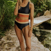 Destácate con elegancia esta temporada con este bikini color block negro, pensado para los días de playa y para relajarte junto a la piscina. El escote tipo banda y el elegante corte en la espalda crean una silueta moderna y favorecedora, audaz y cómoda al mismo tiempo.
